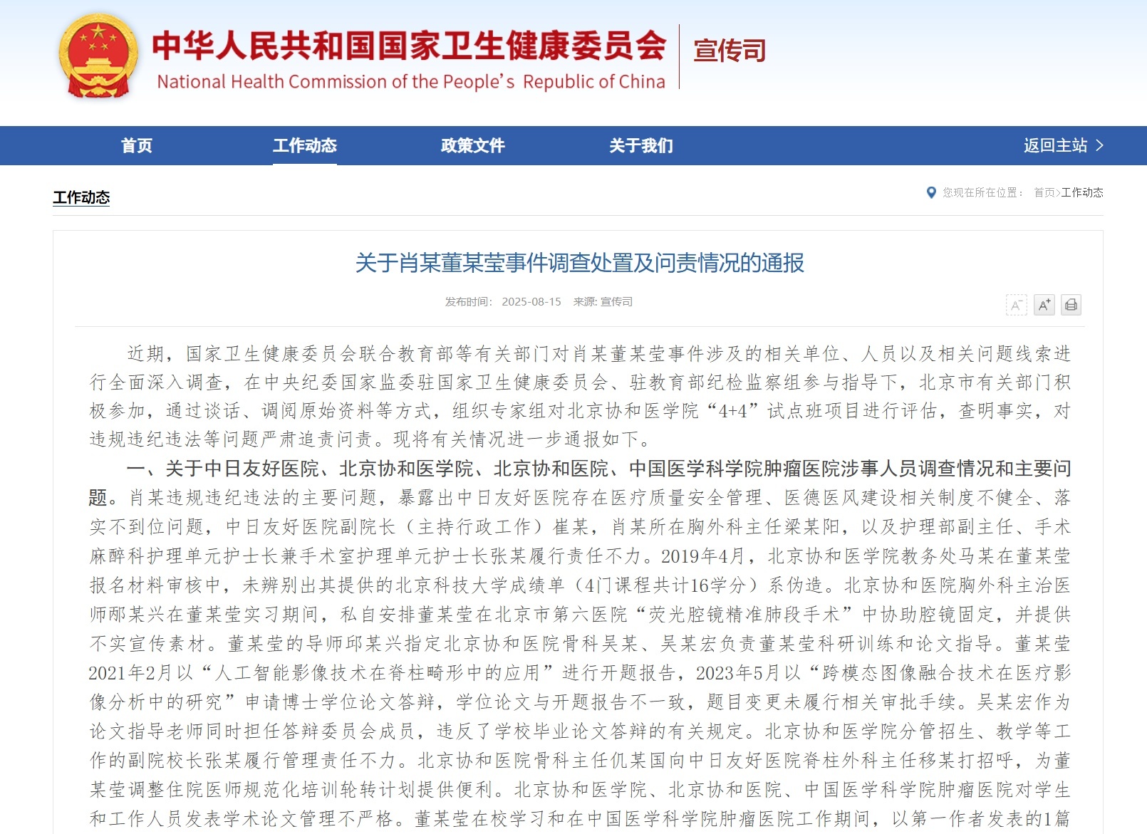 近期,国家卫生健康委员会联合多部门对肖某董某莹事件进行了全面深入的调查,8月15日发布相关情况的通报,对违规违纪违法等问题严肃追责问责。5家机构19人被问责,通报甫一发出,立刻引发社会的广泛关注。这不仅是对个案的严肃处理,更是对整个医疗和教育行业的一次深度审视。